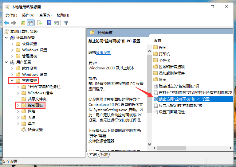 3、在本地组策略编辑器中,先展开右侧的“用户配置”→“管理模板”,点击“管理模板”下的“控制面板”,双击右侧的“禁止访问控制面板和PC设置”。