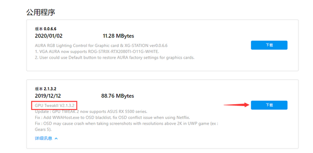 4、在公用程序中,就可以找到GPU Tweak II的下载地址,将其下载安装起来。