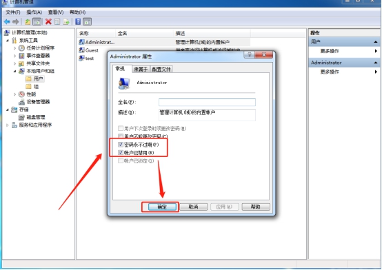 双击打开“Administrator”,在属性页中将“账号已禁用”前的复选框勾选上,点击下方的确定按钮。