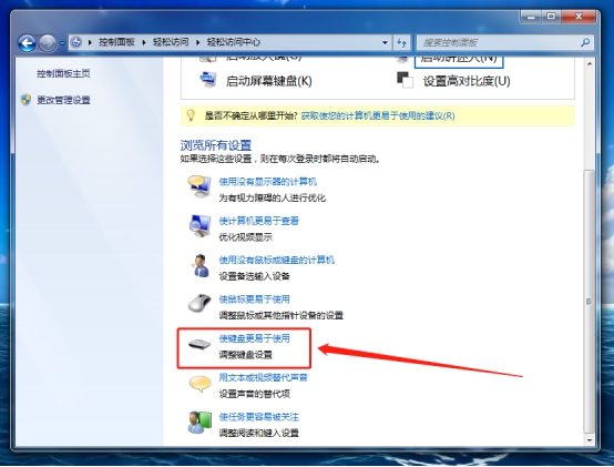 在轻松访问中心页内下拉找到“使键盘更易于使用”设置项,点击进入。