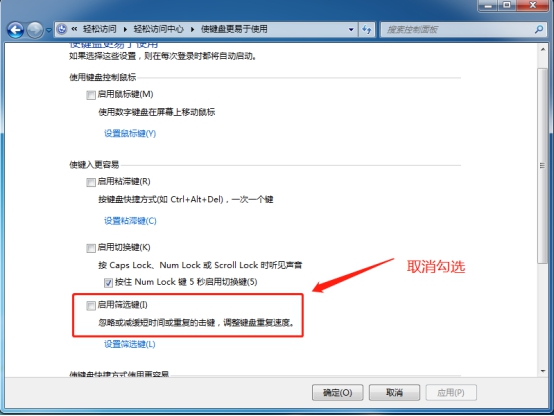在弹出的新设置页中,下拉找到“启用筛选键”设置,将其前方的复选框的勾选状态取消勾选。