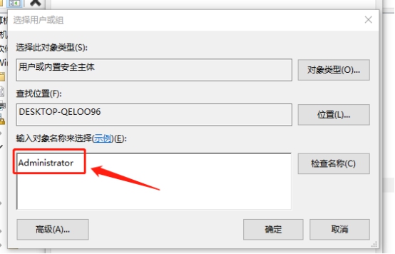 在新弹出的“选择用户或组”页面中,添加相对应的账户进去,通常选用Administrator身份进入即可。直接填写Administrator,点击确定。