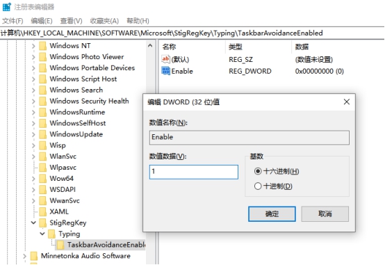 在TaskbarAvoidanceEnabled项下新建一个DWORD(32位)值的文件,并双击打开将其命名为“Enable”,同时将数值修改为“1”,点击确定。