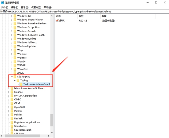 然后再依次找到并打开“StigRegKey”文件夹、“Typing”文件夹和“TaskbarAvoidanceEnabled”文件夹。