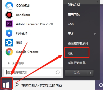 首先,在点击微软图标打开开始菜单,选择进入“运行”,或直接使用快捷键“win+R”唤出运行页。
