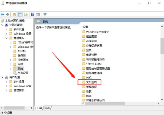 然后在系统文件夹内下拉找到“关机选项”,再点击进入。
