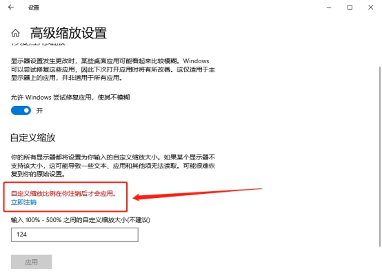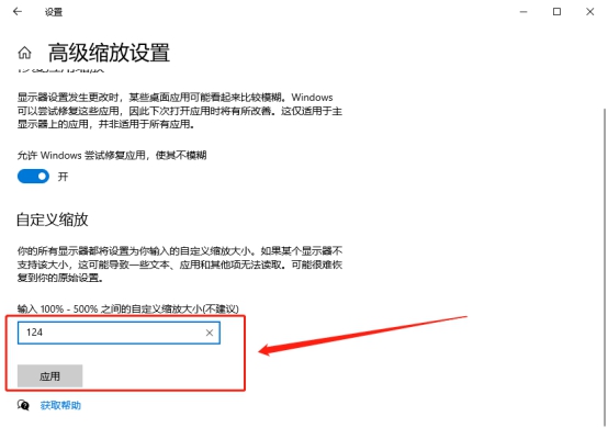 然后下拉找到自定义缩放大小设置框,输入值为124,然后点击应用。