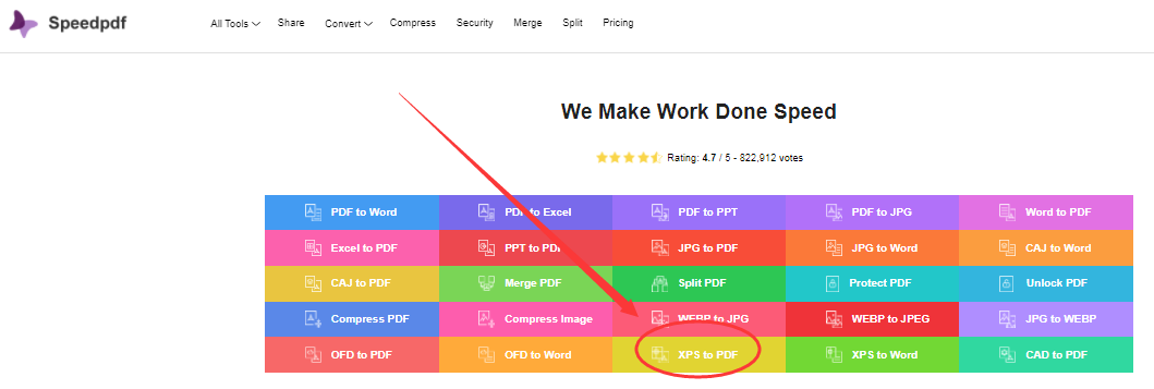 以上两种方法并不能保存每次都成功,所以我们还是需要借助转换工具,比如我们可以使用speedpdf这款在线转换工具,直接搜索进入工具首页后,选择XPS to PDF进入转换;