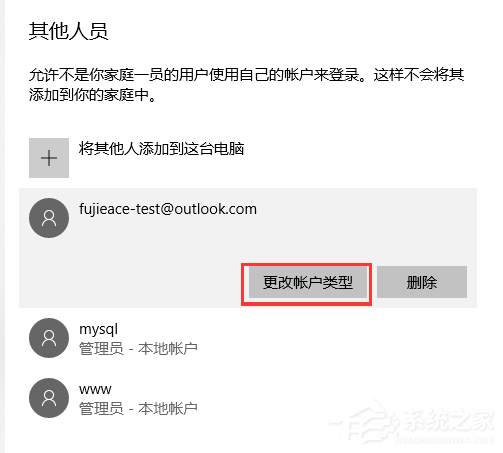 11、现在就算完成了,可以清楚的看到了刚才新添加的“用户账户:fujieace-test.outlook.com”,以及还可以更改此用户账户的“类型”,例如:更改为管理员。