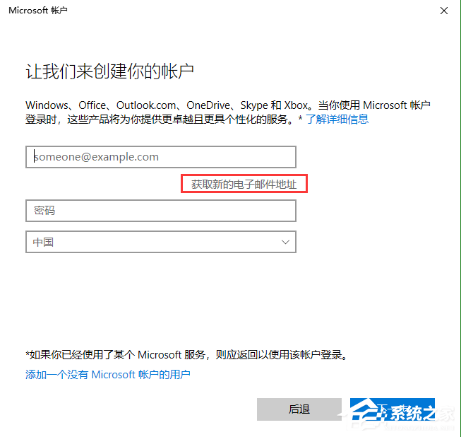 8、点击“获取新的电子邮件地址”,再随意输入一个邮箱和密码,邮箱可以随便写只要没有注册过Microsoft账号就可以了,系统会自动检测的。