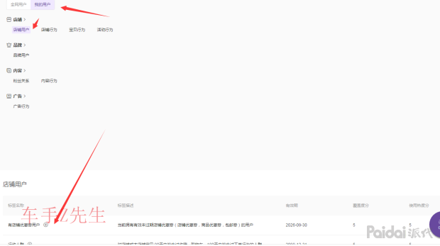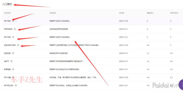 如下图是达摩盘的标签,不知道你震惊没有,所有的箭头的指向的那种标签都可以点进去,点进去之后是显示的系统推荐给你的各类型人群标签