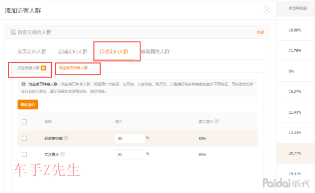 先来说系统人群,比如淘宝首页潜力人群,店铺定制人群,淘宝优质人群,部分类目更新后还有一个叫行业定向人群 (里面又细分为行业高潜人群和淘宝首页种草人群),这部分人群的重要性不言而喻,从下图的字面意思我们就可以看得出来,当你宝贝没有乱标签的时候,在这类相关的人群溢价帮助肯定是非常大的。