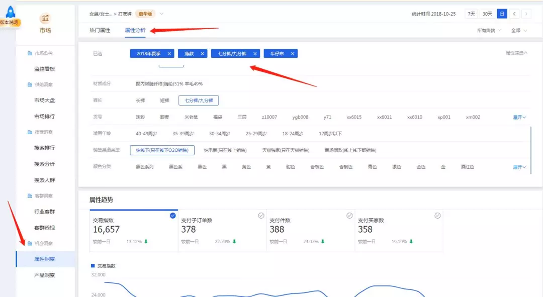 12. 接着进入他的宝贝,去看它的属性,知道属性后,进入生意参谋-市场洞察-属性洞察(这个功能只有9000元版本才有)-属性分析,找到相关类目,会有个热销榜单,里边有个商品选项,选2-3个属性。