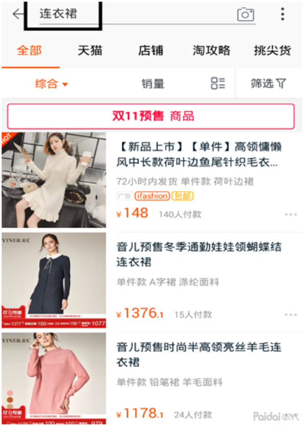 一个买家要去淘宝上面购物,按照正常的购物行为,首先去搜索这个产品的关键词,也就是这个这个关键词具体叫什么,直接去搜索,然后找到符合适合自己的产品。我们以女装连衣裙为例,如下图: