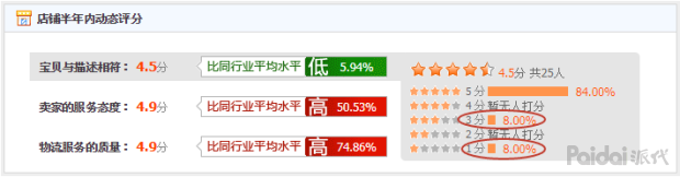 (当前)DSR动态评分=总分数/总人数=(5分X21+3分X2+1分X2)/25=4.52