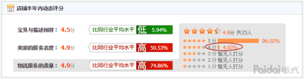先看上图这个4.9的物流分,打4分的占总人数(25人)的4%,计算得出1人打了4分,另外24人(占96%)是给了5分的。