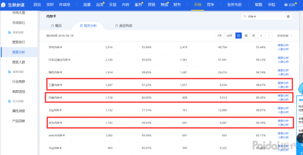 再通过生意参谋查询数据后,看到三星、华为手机款的无线内存卡竞争相对更低一些,这也提醒了我们,可以根据手机型号做市场细分。