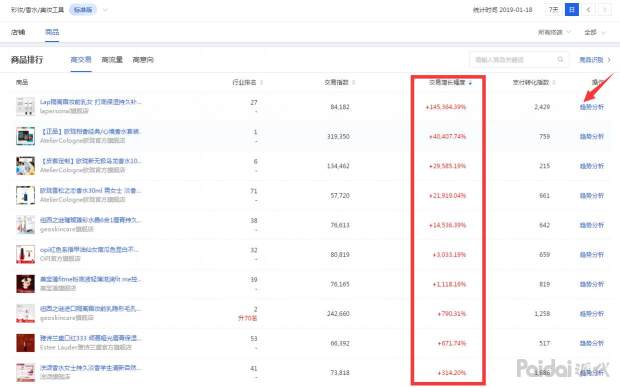 如果你是要做新品就需要我们在生意参谋-市场-供给洞察-市场排行-商品中,找近7天交易增长幅度比较大的,一定要是近期指数从很低开始一直递增的单品,像下面单品图2一样,添加监控。(竞品的流量渠道最好是以搜索端口为主)