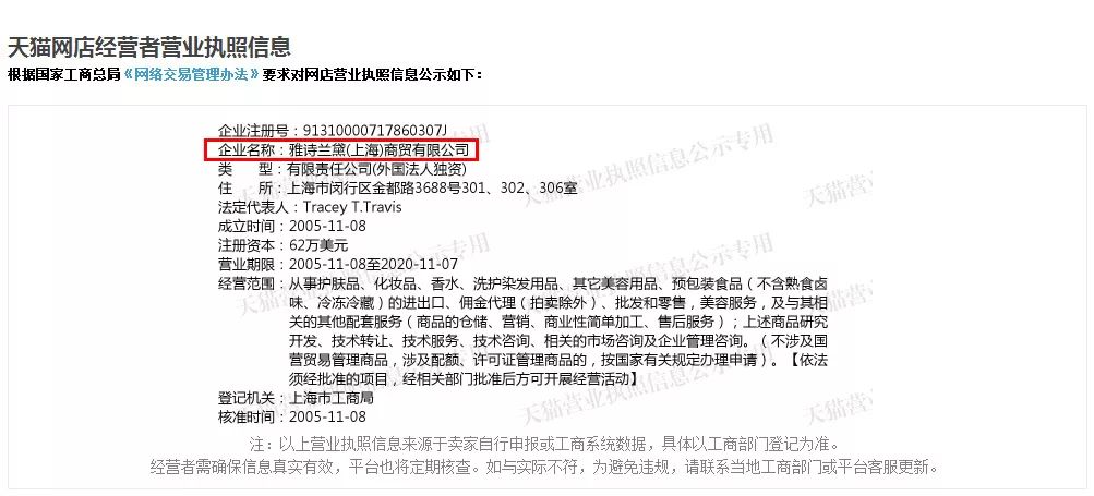 正确输入后就能查看店铺的工商资质证件了,可以很清楚地看到雅诗兰黛的官方旗舰店的确是由品牌方自己运营的!