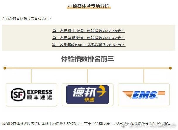 在神秘顾客体验式服务暗访中,体验平均指数为59.73分。顺丰速运以87.55分的体验指数排名第一;其次是德邦快递,体验指数为81.42分;第三名是邮政EMS,体验指数为78.38分。在十个品牌快递中,达到平均体验指数值的有4个品牌。