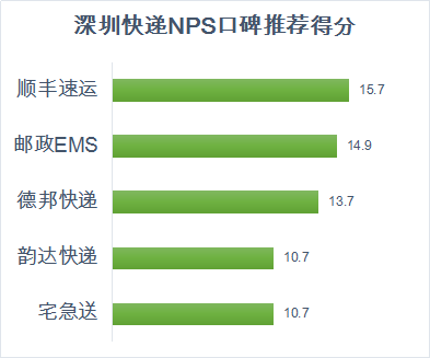 在本次调研中,深圳市快递NPS口碑推荐平均值为11.2分。前五名依次为顺丰速运15.7、邮政EMS14.9、德邦快递13.7、韵达快递10.7、宅急送10.7。