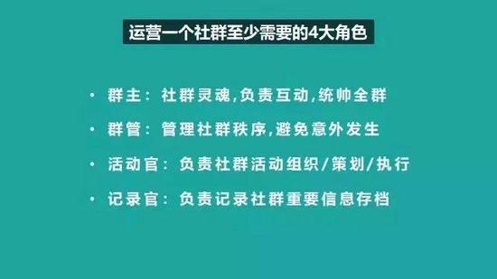 而真正参与到社群运营的人员,至少需要需要4个,包括群主、管理员、活动官和记录官,具体职责分工,可参考下图: