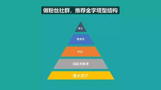 做粉丝社群推荐金字塔结构而不推荐环形结构,原因是金字塔结构会将社群里的人群细分成几个不同层次的人,而所有人都需要认可群主,有利于粉丝文化打造。