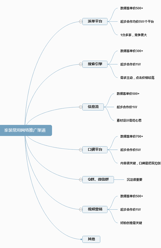 只要通过网络渠道的营销均属于此范畴,而家装行业目前涉及较多的版块有派单平台类(如齐家、土巴兔、齐装、土拨鼠、搜房等大大小小的全国及本地平台)、搜索引擎营销(百度、360、搜狗竞价及优化)、信息流广告(今日头条、微信朋友圈、地方性公众号或服务号等)、口碑推广平台(大众、得意等)、社交软件的利用(Q群及微信群等)、视频营销(抖音、快手、以及搜狐,优酷等展示平台)再然后就是各种论坛发帖,找各种曝光渠道。