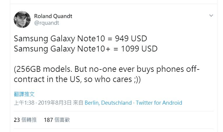 除保护壳配件之外,有关新旗舰Galaxy Note 10系列的售价,也有最新爆料消息传出。据知名爆料达人Roland Quandt于个人推特发文称,今年的Note 10系列将推出两款不同屏幕尺寸与市场定位的机型,分别为Note 10(传屏幕为6.3寸)与高端大屏幕尺寸的Note 10+(传屏幕为6.8寸);以美国市场销售的256GB容量为例,他推估Note 10售价为949美元;高端版Note 10+售价为1099美元。