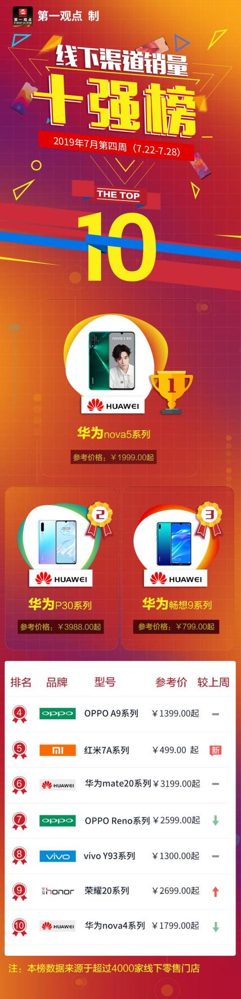 著名的行业数据调研机构《第一观点》8月2日发布了《2019年7月第4周(7.22-7.28)全国线下渠道手机销量排行榜单》,通过对全国近4000家线下零售网点的实时采样,数据归纳及整理,7月第4周销量排名Top 10的机型如榜单所示:
