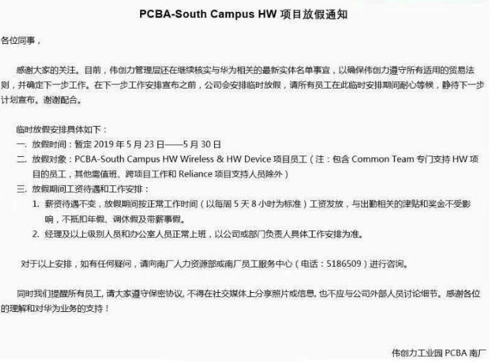 先前由于美国禁令导致伟创力断供华为并扣押部分物料,此举也让自己失去了华为供应链成员的身份进而失去了华为代工订单。在失去华为的“大单子”后,伟创力南厂便出现了产能过剩的情况,大量员工无事可做工厂只能给他们放假。内部公告显示,公告显示放假时间是5月23日——5月30日八天的时间,不过有员工透露实际放假时间要更长。