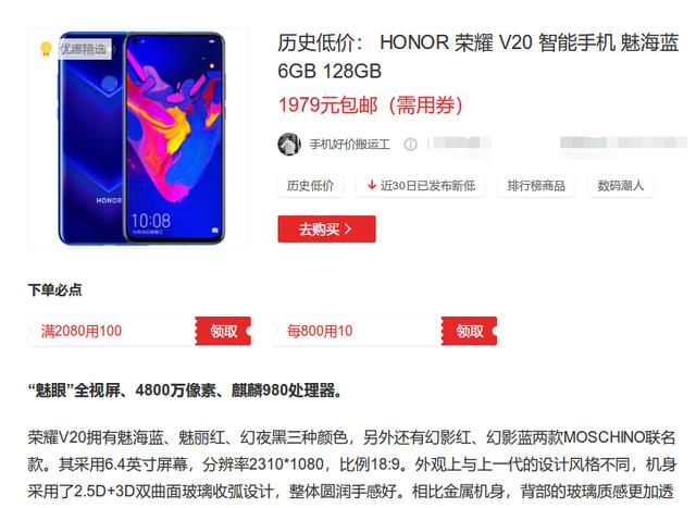 荣耀V20首次降至“1”字头,成为最值麒麟980手机