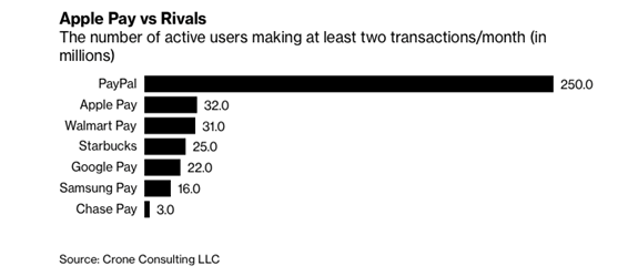 以Apple Pay为例,这个诞生于2014年移动支付工具较早抢占了移动支付先机,但根据彭博社报导,直到2018年末,全美仅有60%商店支持该支付工具,根据专业人士测算,美国Apple Pay每月使用两次以上用户为3200万,同期PayPal则有2.5亿之多,在2018年末,全球iphone用户大致有31%激活了此项功能。