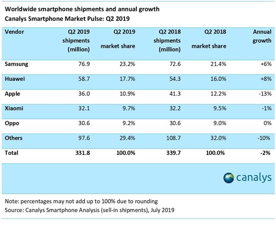 从绝对值看,iPhone的销售速度确实在放缓,2019年Q2较上年同期减少了530万部,从收入看,iPhone的销售额也由上季度的310亿美金降为本季度的260亿美金。