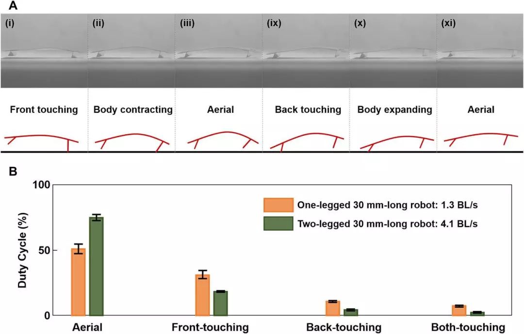 利用了这种更有效的飞驰式步态机制,两足机器人在类似驱动条件下的跑步速度是单足机器人的3倍。根据高速摄像机拍摄的步态,双腿机器人的空中占空比(75%) 比单足机器人(51%)提高了24%,从而提高了运行速度。