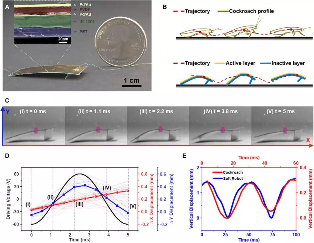 在显微镜下,可以看到这款机器人包括一个18微米厚的聚偏氟乙烯层,两个50纳米厚的钯(Pd) / 金(Au)电极(聚偏氟乙烯膜的顶部和底部) ,一个25微米厚的粘合性硅树脂,和一个25微米厚的聚对苯二甲酸乙二酯(PET)基板。