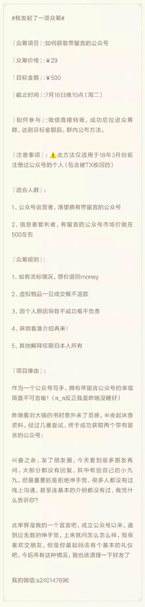 上周末我在朋友圈发起了一个小规模的众筹活动,项目是:如何获得带有留言功能的公众号,本文主要描述项目前后心路历程及启发,有些标题党,详情且听正文分解。
