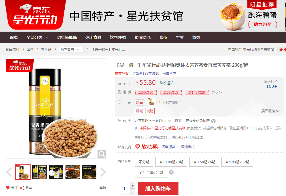 截至目前,京东在全国832个贫困县上线商品超300万种,实现销售额超600亿元,直接带动80万户建档立卡贫困户增收。