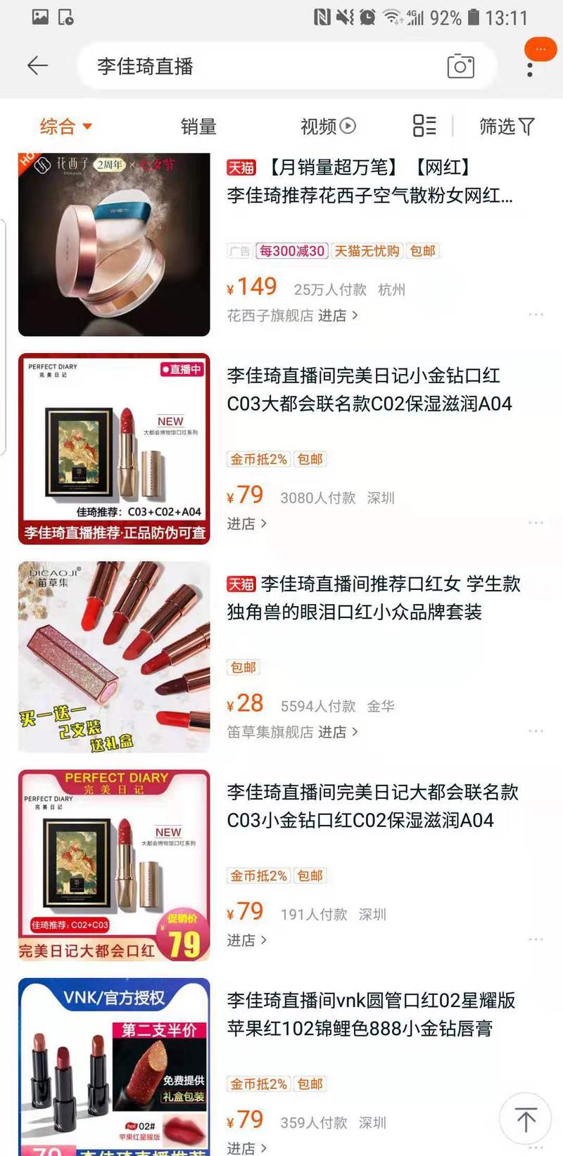 在淘宝输入“李佳琦直播”,页面的结果排在前五的全是国货美妆品牌,从花西子到完美日记,再到VNK,直播主播在国货美妆的带货上,扮演着不可替代的角色。