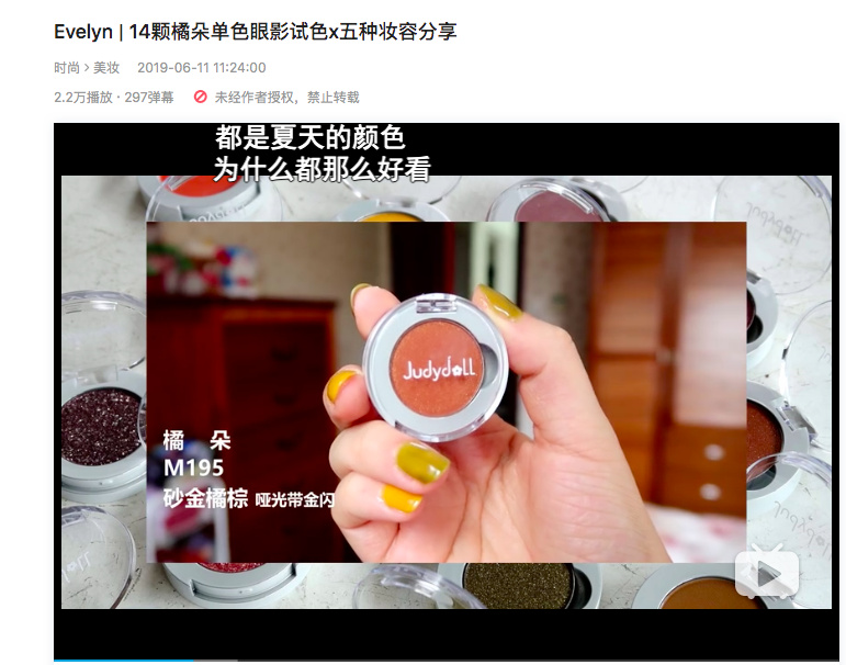 橘朵是一个新起的国货品牌,眼影盘是橘朵主推的单品。在B站上,关于橘朵的视频有50页,和完美日记的数量持平,彩妆的颜值基本上决定了能吸引多少注意,B站上的美妆UP主再对眼影盘的粉质进行点评,很多有效的订单就会产生。