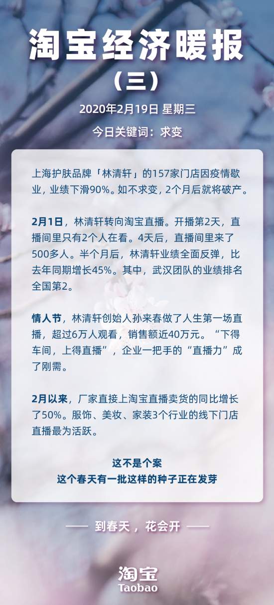 淘宝发布的《淘宝经济暖报》显示:2月以来,每天超过3万人来淘宝开新店,其中超过2成来自线下店铺。传统行业用自己的努力和创新,排除疫情的影响,获得增长。