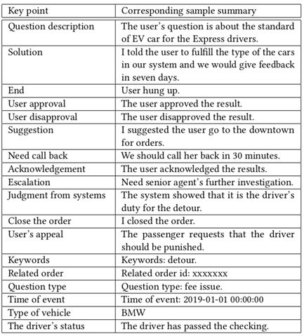 我们提出利用辅助要点序列(Auxiliary keypoint sequence)来解决以上这些挑战。要点(key point)是工单摘要中一个片段的主题,例如“问题描述”。我们通过人工总结工单摘要,整理得到滴滴场景下51个要点;详见表1