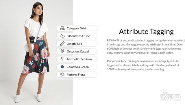 Fashwell的API还有许多别的功能,例如它支持图片标记,通过实时识别图像中的每个产品的的特定属性,来自动生成图片标签,使得购物网站的图片搜索技术能够更加快速、准确、规模化。这个图片标记可以为图片加上很多不同类别的标签,例如类别或者设计。