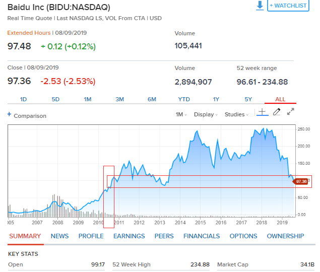 百度的股价已经跌到了97美元,这是2010年9月时的水平,市值更是跌至340亿美元。那一年,谷歌把中文搜索市场,拱手让给了百度。也由此,百度进入了九年的‘打着望远镜,也找不到对手’的美好岁月,可以魏则西,可以莆田医院,可以高考填志愿。