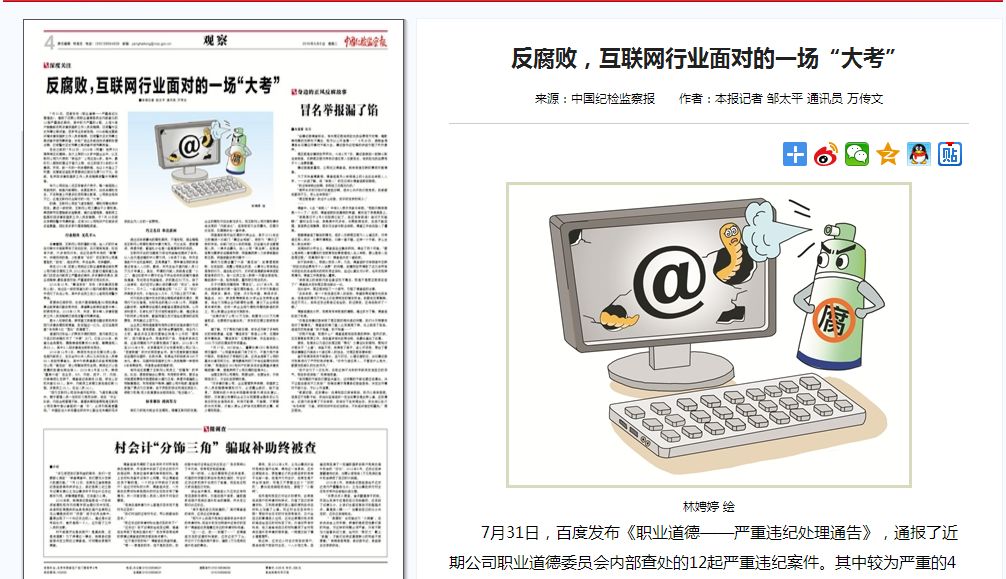 就在五天前(8月6日),《中国纪检监察报》还发布了《反腐败,互联网行业面对的一场“大考”》的消息,聚焦的内容也是“治理互联网公司腐败”。