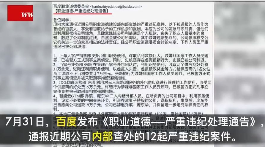 - 7月31日,百度发布《职业道德——严重违纪处理通告》,通报近期公司内部查处的12起严重违纪案件。