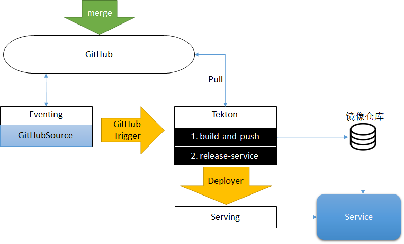 - Eventing 监听到 merge 事件,发送给 GitHub Trigger 服务;