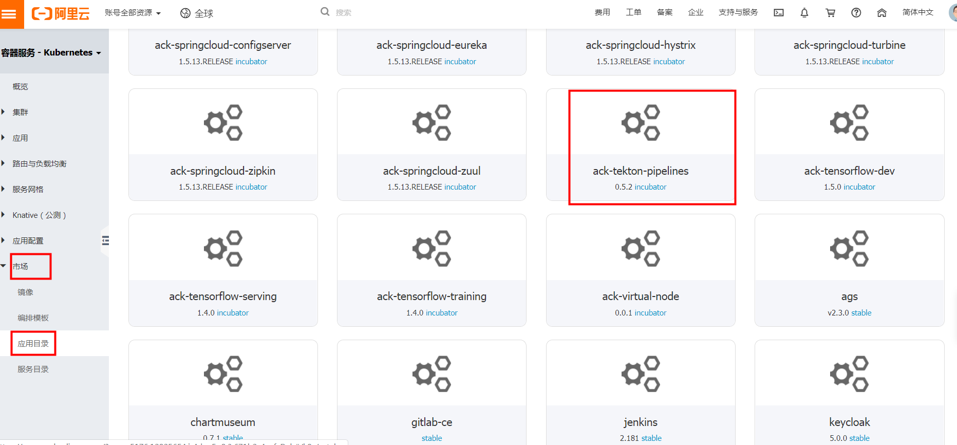 - 部署 Tekton。通过阿里云容器服务控制台,应用目录选择 ack-tekton-pipelines 进行安装部署 Tekton;