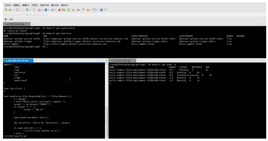 当 http://github.com/knative-sample/eventing-tekton-serving 有 pull request 发生时就会自动触发 deployer-github-trigger 的执行,deployer-github-trigger 首先编译镜像,然后更新 hello-sample service 镜像,从而完成自动化发布。