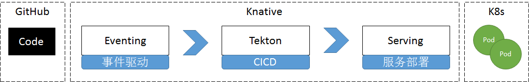 现在的场景是这样的:代码构建->事件驱动->服务部署。那么对应到 Knative 中,需要 Eventing、Tekton 和 Serving 一起协作来实现这个场景。